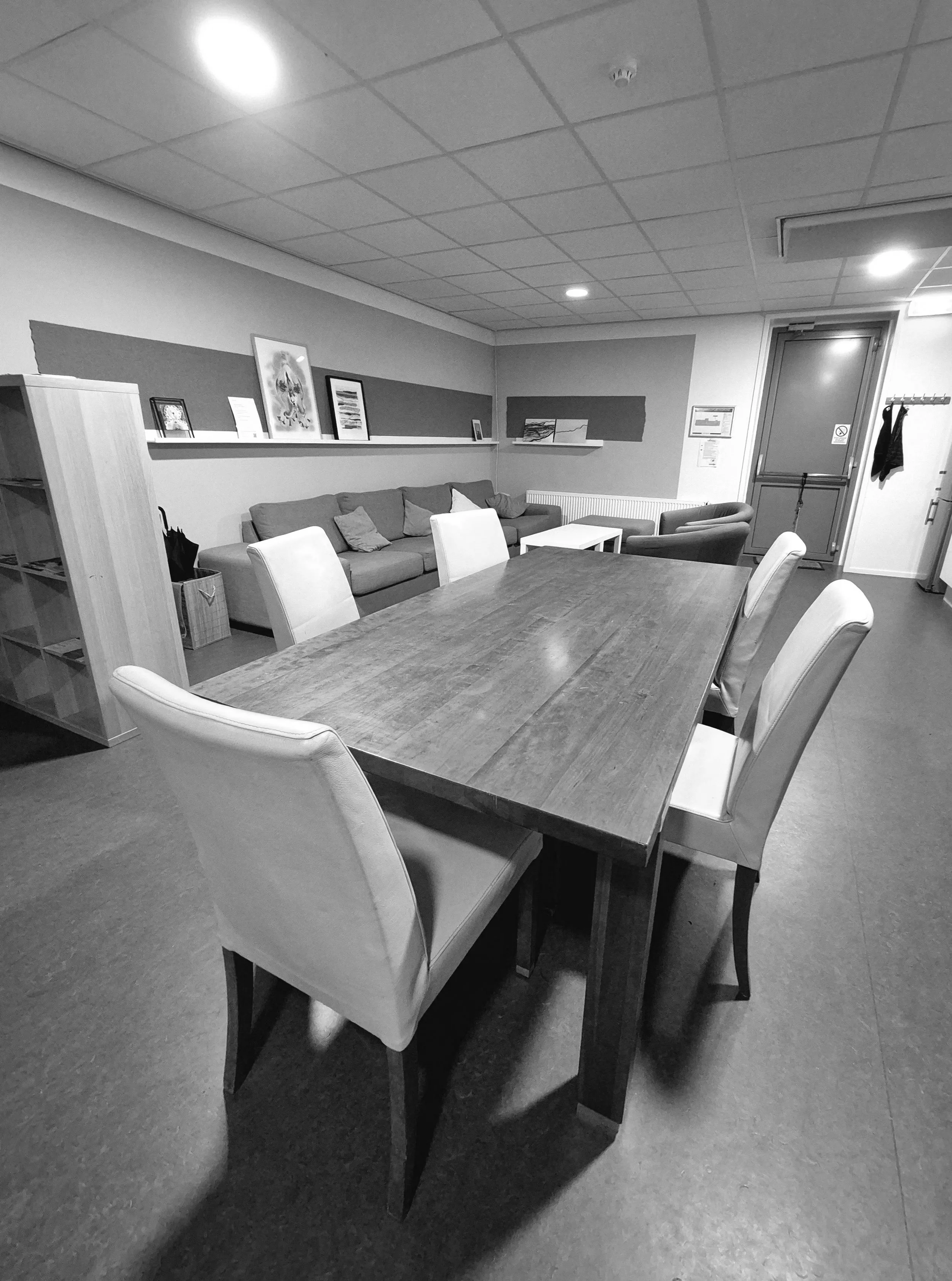 Vóór je onze ruimtes betreedt is er een gemeenschappelijke ruimte met keukenblok, eettafel & stoelen en ruime loungebank die we delen met andere kunstenaars uit ons pand. Zie de foto links.